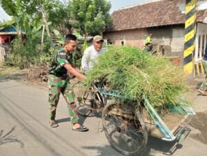 Melihat Bapak Hendro tampak kelelahan mendorong gerobak berisi rumput untuk pakan ternak, Praka Angga tanpa ragu langsung turun tangan membantu. Keduanya pun bersama-sama mendorong gerobak melewati jalan kampung sambil berbincang ringan.