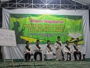 BANYUWANGI – Suasana religius dan khidmat menyelimuti Dusun Paluagung, Desa Kendalrejo, Kecamatan Tegaldlimo pada malam hari ini. Ratusan warga bersama wali santri memadati halaman Musholla Sunan Ampel untuk merayakan capaian spiritual dalam acara Pengajian Tasyakuran Khotmil Qur’an ke-XXI TPQ Sunan Ampel, Senin (26/01/2026).