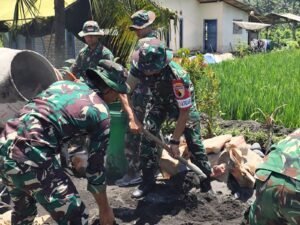 Tampak jelas Letkol Czi Bayu Nugroho tak segan turun langsung, memasukkan pasir di mesin molen/alat penyampur adonanan cor dan memastikan setiap jengkal saluran air terbangun sesuai standar. Keringat yang menetes dari Dansatgas menjadi simbol kemanunggalan TNI dengan rakyat, sebuah wujud nyata kepedulian terhadap infrastruktur dasar desa.
