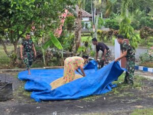 ​Melihat kondisi tersebut, tanpa menunggu perintah, beberapa anggota Satgas TMMD Kodim 0818 yang sedang beristirahat setelah bekerja keras di lokasi pembangunan drainase, segera berinisiatif membantu. Mereka berlari menghampiri lokasi penjemuran dan dengan sigap bahu-membahu bersama petani menutup padi dengan terpal.