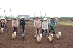 Suasana penuh semangat terlihat di lapangan. Para petani bersama prajurit TNI dan anggota Polri bahu-membahu menanam jagung di lahan bekas panen, menciptakan pemandangan yang sarat makna kebersamaan dan kerja keras.