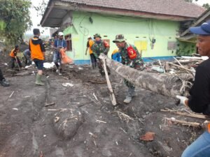 Lumajang — Upaya pemulihan pasca-erupsi Gunung Semeru di Kecamatan Pronojiwo terus menunjukkan progres signifikan. Personel Kodim 0821/Lumajang yang tergabung dalam Satgas Penanggulangan Bencana kembali mengintensifkan aksi kemanusiaan dengan membersihkan material vulkanik yang menimbun rumah-rumah warga Dusun Sumbersari, Desa Supiturang, Jumat (28/11/2025).